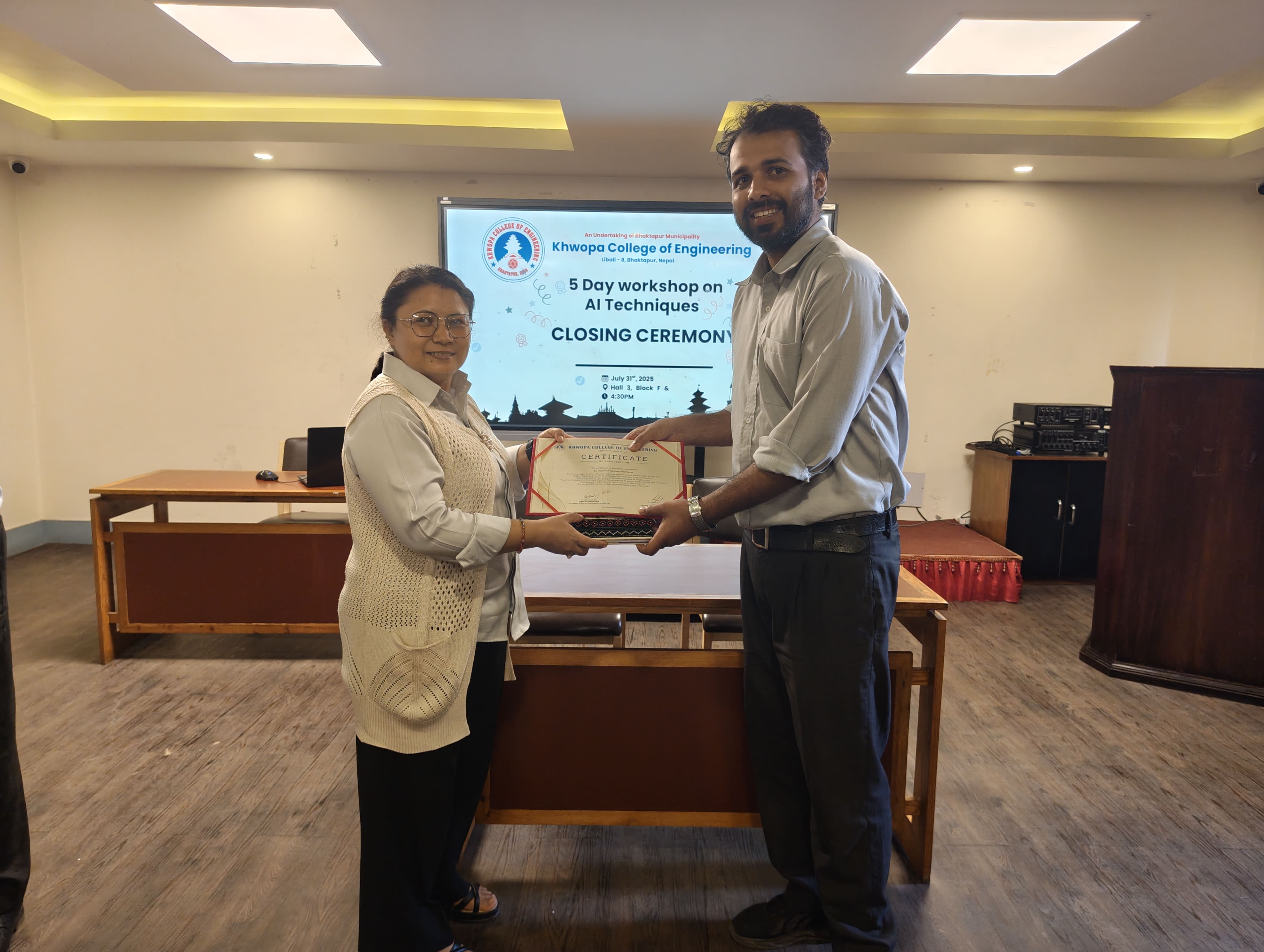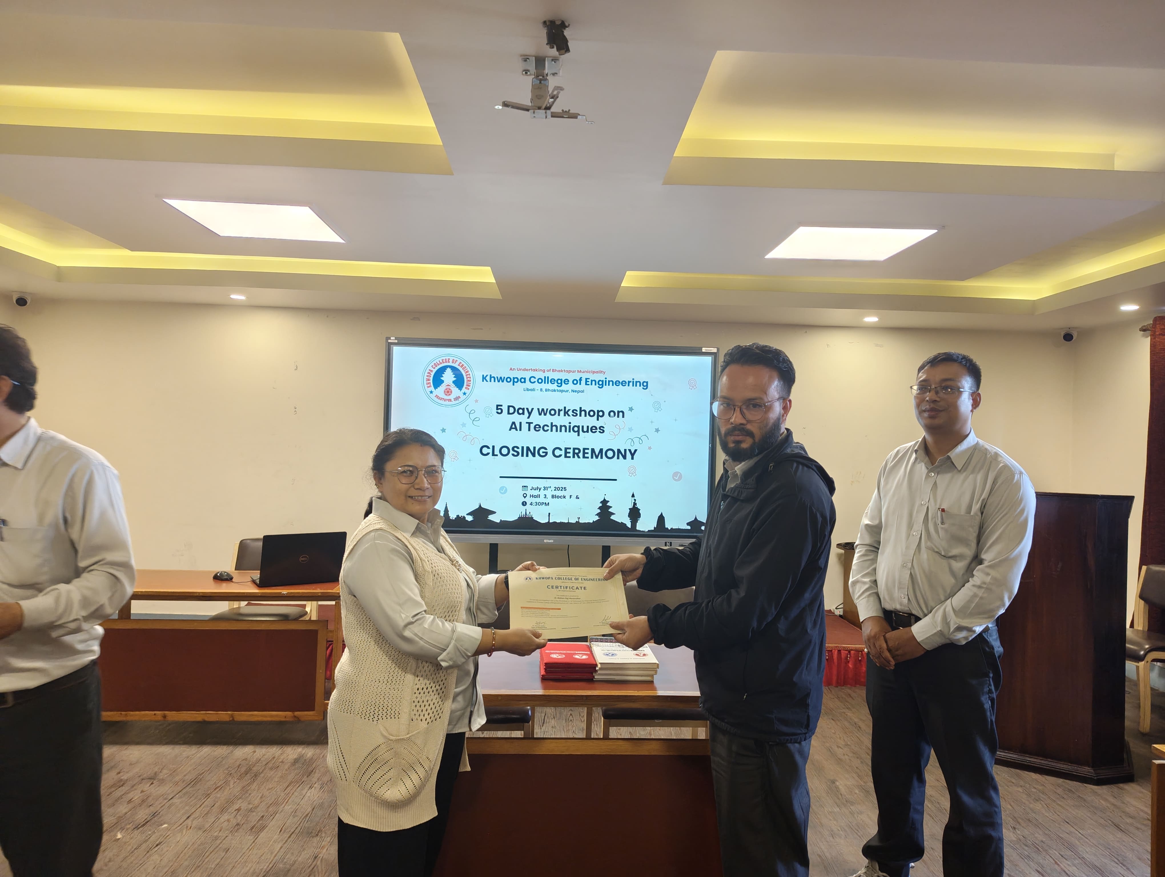 The workshop concluded on 15th Shrawan 2082 with a closing ceremony attended by Vice Principal Er. Ratna Sova Prajapati as the chief guest. Also present were Er. Dinesh Gothe, Head of the Department, and Deputy Head Er. Naresh Khatri. In her remarks, Vice Principal Prajapati encouraged faculty to apply their AI skills in mentoring and research, emphasizing collaboration and knowledge sharing. Participants received certificates of participation, while session mentors were awarded certificates of appreciation.